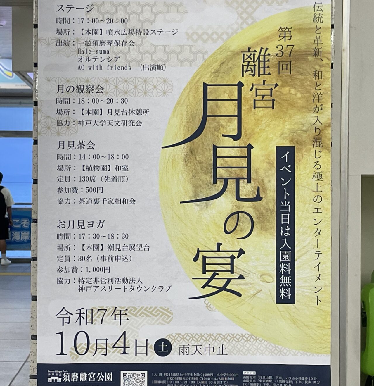 須磨離宮公園で10月4日(土)に「第37回離宮月見の宴」が開かれます。平安時代に在原行平が月を眺めたと伝わる地で、毎年人気の秋の恒例イベントです。今年も音楽ステージや月の観察会など、多彩な催しが用意されています。