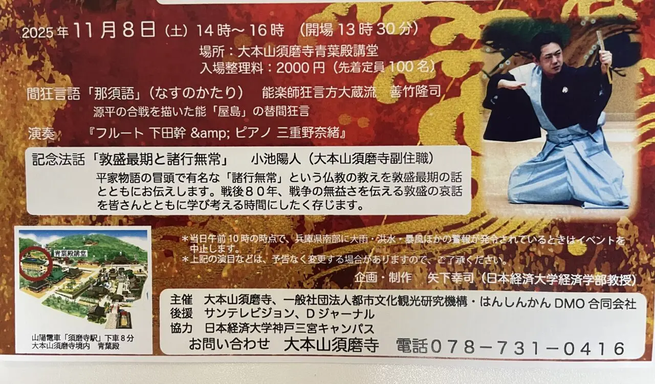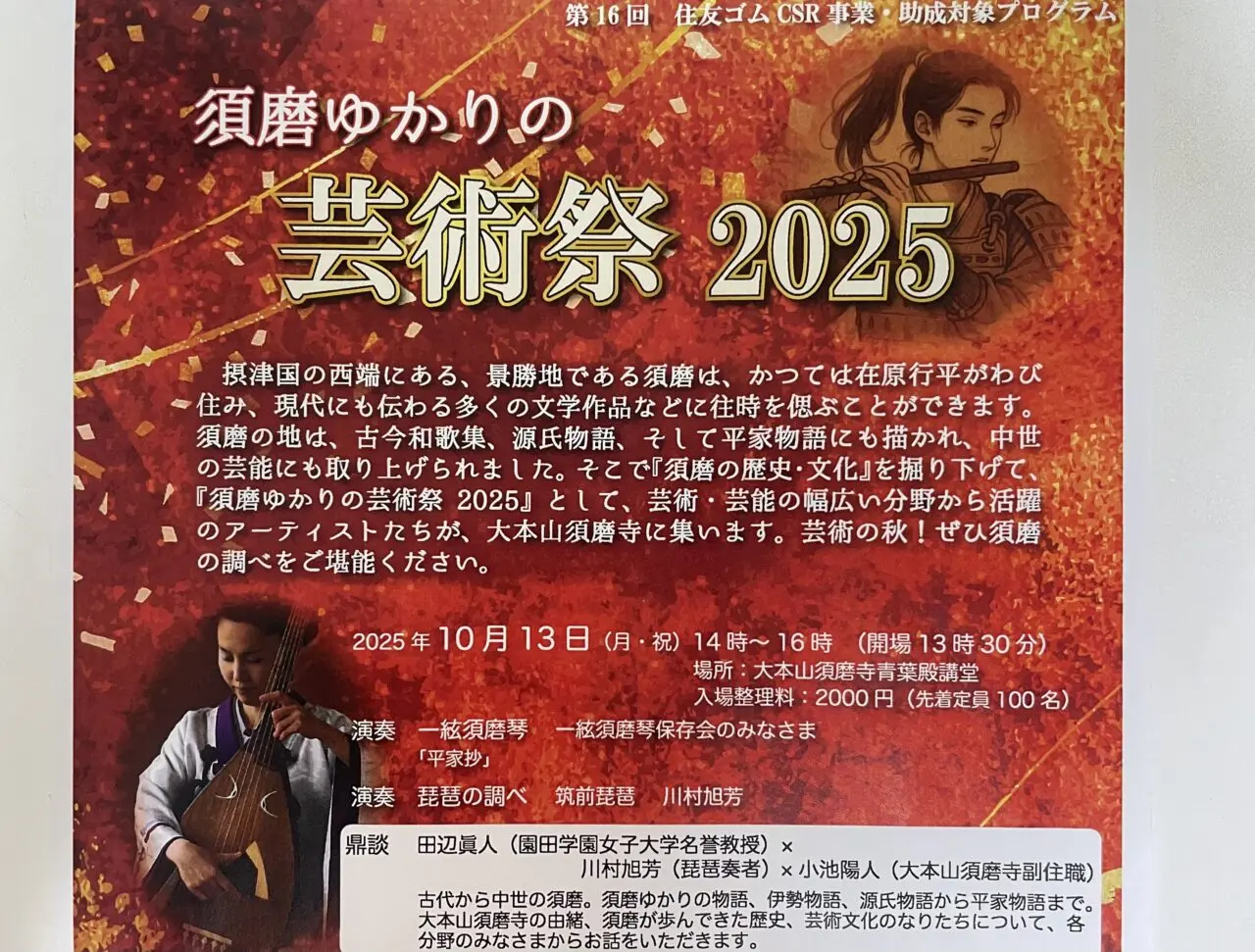 芸術の秋に、須磨ゆかりの文化と音楽をじっくり味わえる「須磨ゆかりの芸術祭2025」が、須磨寺境内の青葉殿講堂で開催されます。