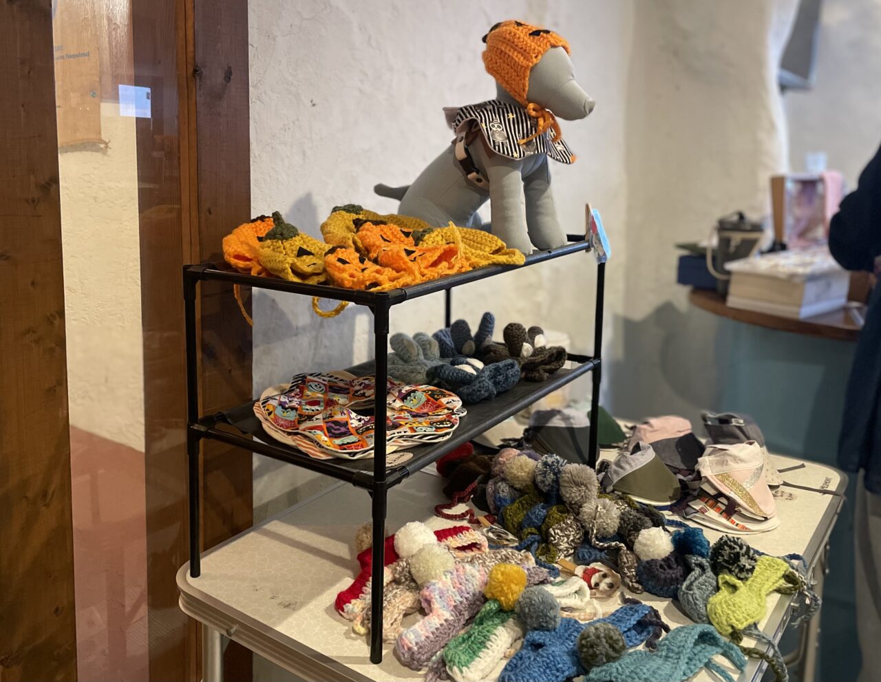ニットのキャップや、紫外線から目を守るサンバイザーなど、愛犬とのお出かけがさらに楽しくなるグッズが並んでいました。