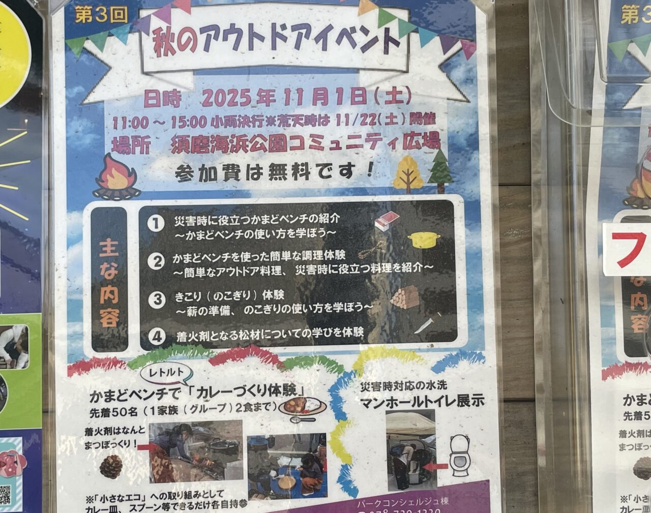 須磨海浜公園コミュニティ広場で、11月1日(土)に「第3回 秋のアウトドアイベント」が開催されます。災害時にも役立つアウトドア体験を親子で学びながら楽しめる内容になっています。