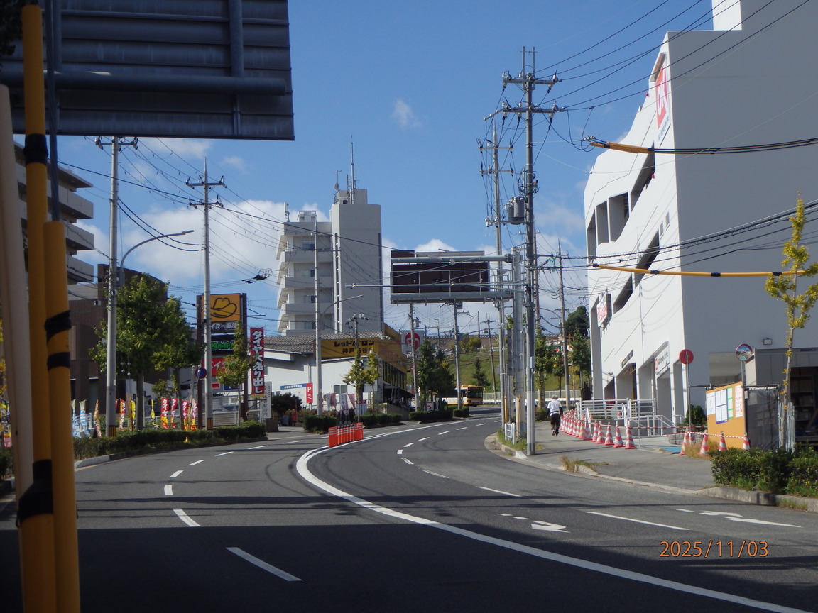 11月3日現在、店舗前の道路にはセンターライン沿いにガードパイプが設置されていて、右折での入出庫ができないようになっています。
