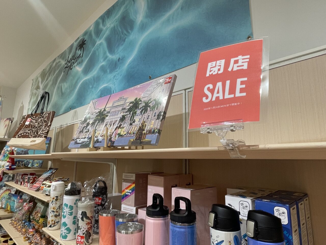 閉店を知らせる店頭の大きな赤い看板が目を引き、店内にはセールのPOPが並んでいます。