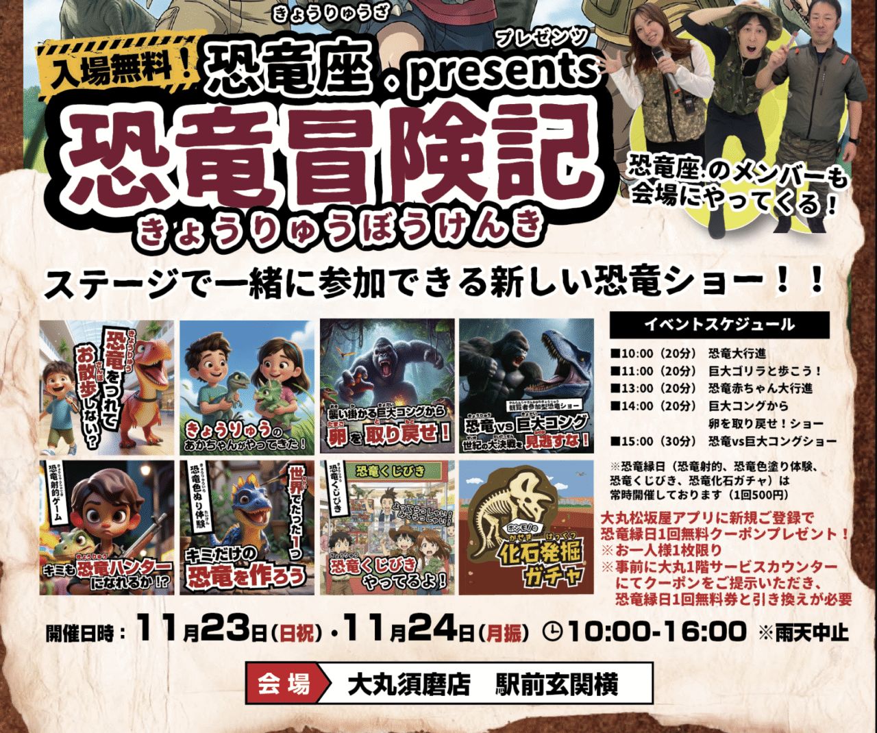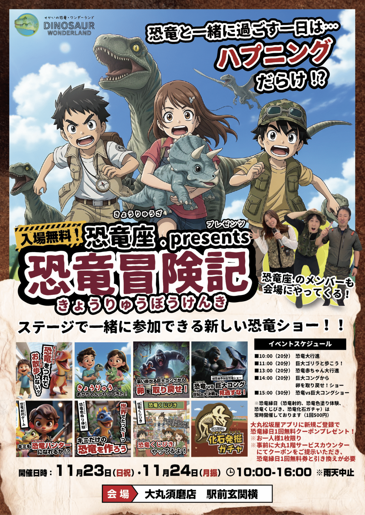 大丸須磨店の駅前玄関横スペースで、11月23日(日)と24日(祝・月)の2日間、「恐竜冒険記」が開催されます。恐竜たちと間近でふれあえる迫力満点のステージイベントが終日行われ、家族で一緒に楽しめる内容がそろっています。入場無料です。