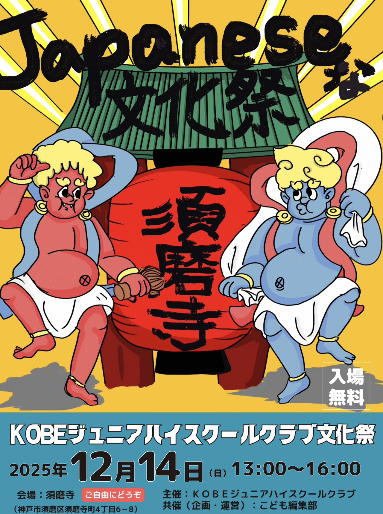 須磨区の須磨寺本坊で、子どもたちと地域が一緒につくる新しい文化祭「Japaneseな文化祭 in 須磨寺」が初開催されます。主催はKOBEジュニアハイスクールクラブ。華道・茶道に加え、和太鼓や一絃琴、日舞など和文化の魅力にふれられる内容で、地域部活動としては初の文化祭となります。