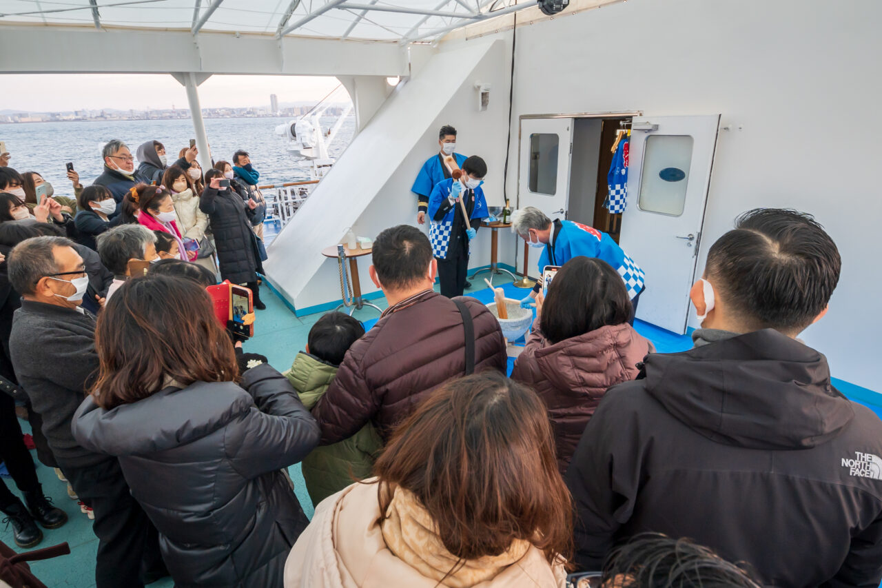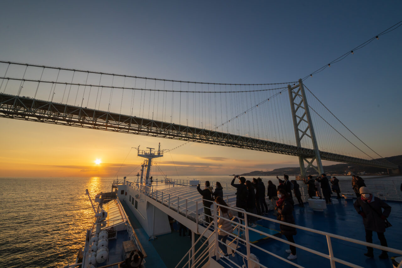 船は早朝に神戸港を出航し、明石海峡大橋の真下を通過しながら、水平線から昇る初日の出を海上から眺められる内容です。