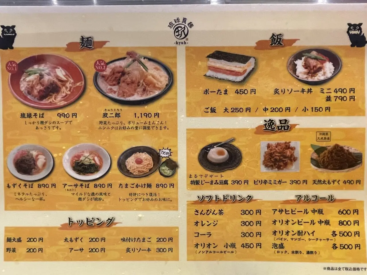 「琉球真麺 玖-kyuh-」では、そばだけでなく沖縄の味を満喫できるサイドメニューも充実。沖縄名物のスパムおにぎり、ポークたまご(ポーたま)や特製ソーキを乗せた炙りソーキ丼などが楽しめます。