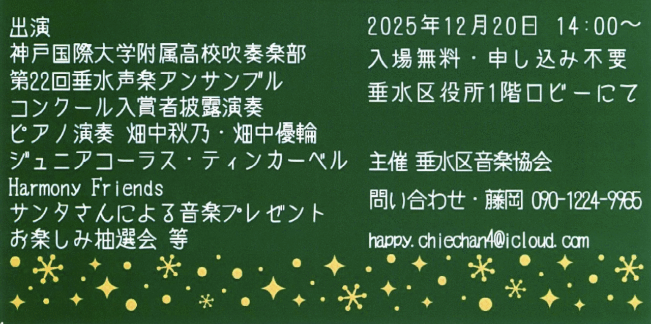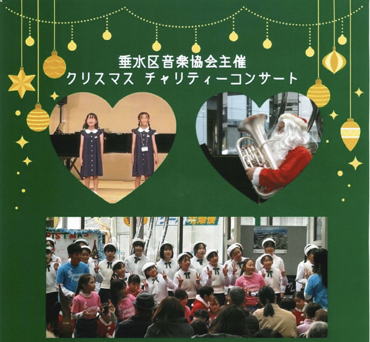 12月20日、レバンテ垂水2番館1階ロビーを会場に「クリスマスチャリティーコンサート」が行われます。会場は駅近で立ち寄りやすく、買い物や用事の合間に気軽に楽しめます。