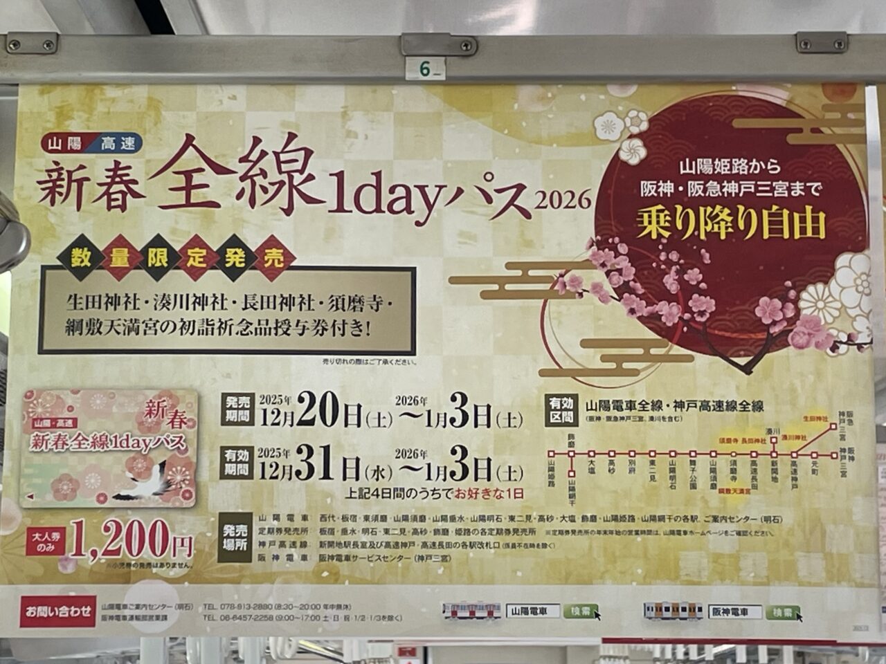 元日を中心に、1日だけ集中的に出かけたい方に向いた切符で、数量限定発売となっています。山陽電車全線に加え、神戸高速線も利用でき、三宮方面への移動にも便利です。