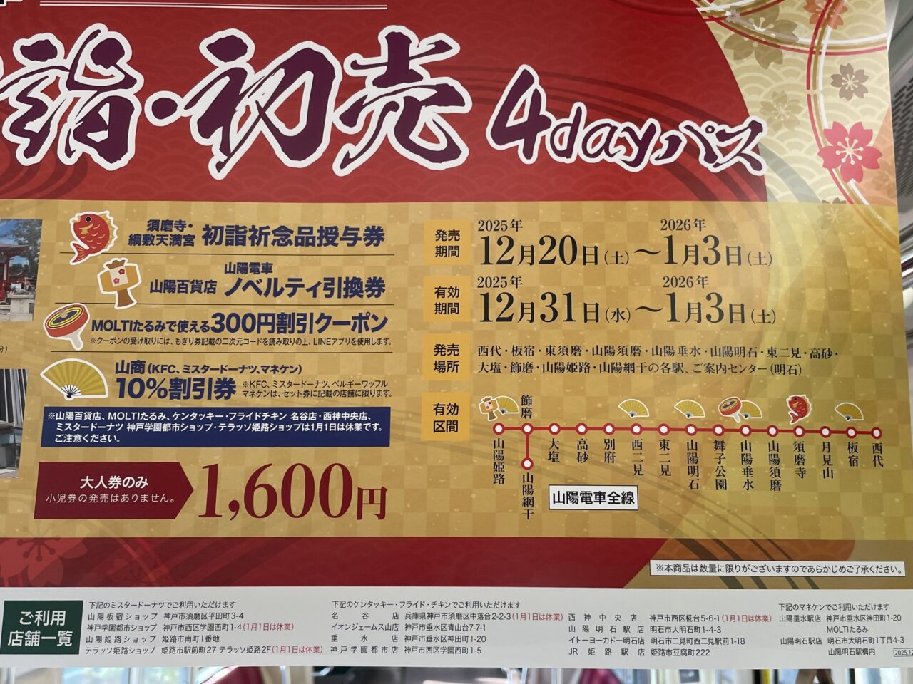 4日間連続で利用でき、須磨寺・綱敷天満宮の祈念品引換券に加え、沿線施設で使える特典も付いています。