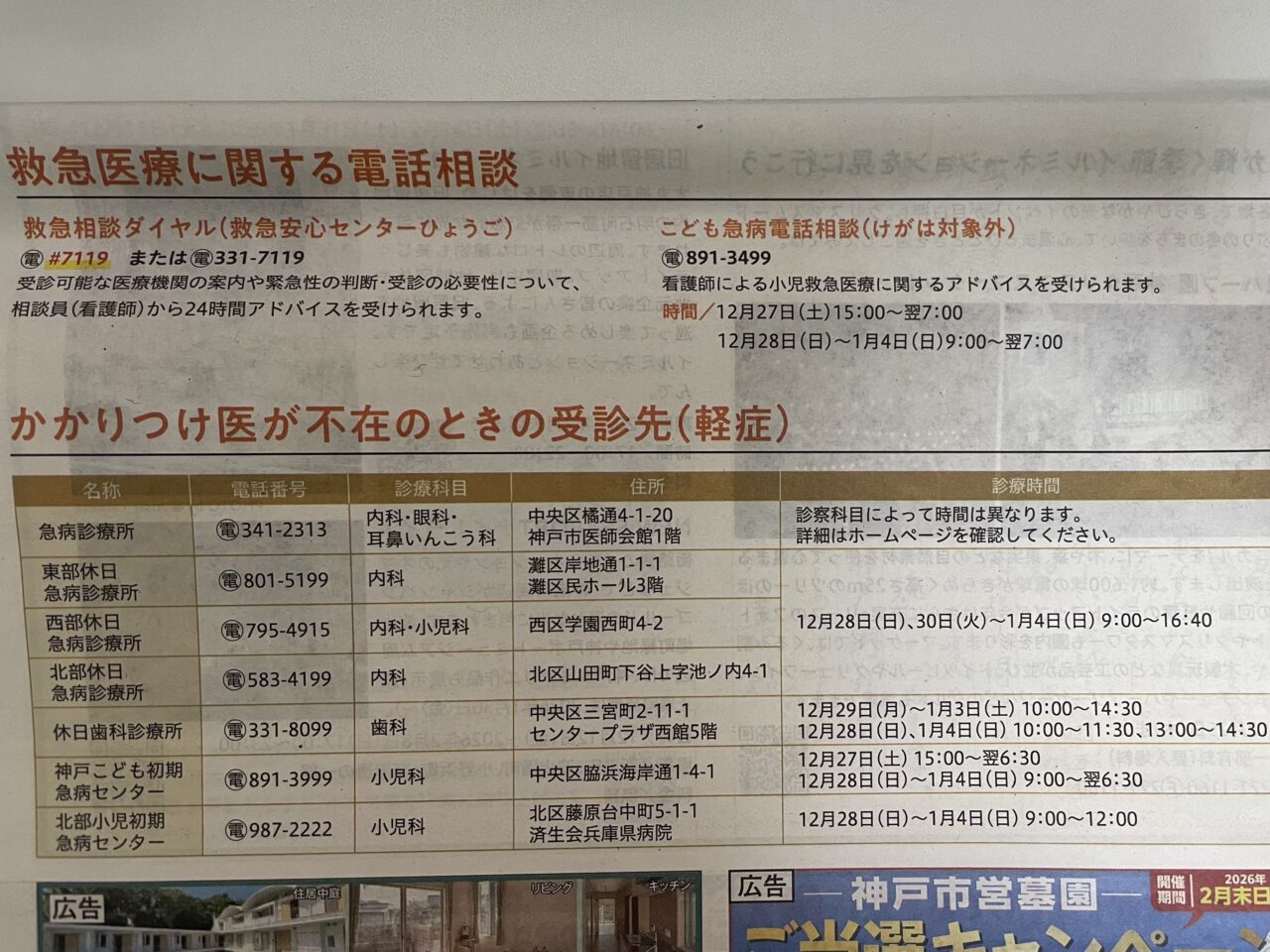 年末年始は多くの医療機関が休診となり、急な体調不良やケガの際に「どこを受診すればよいのか」と迷いやすい時期です。神戸市が公表している2025〜2026年の年末年始救急医療体制のポイントをまとめました。