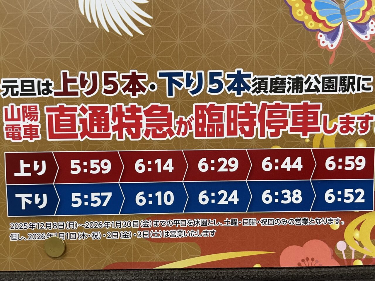 【直通特急 臨時停車時刻(1月1日・須磨浦公園駅)】山陽電車