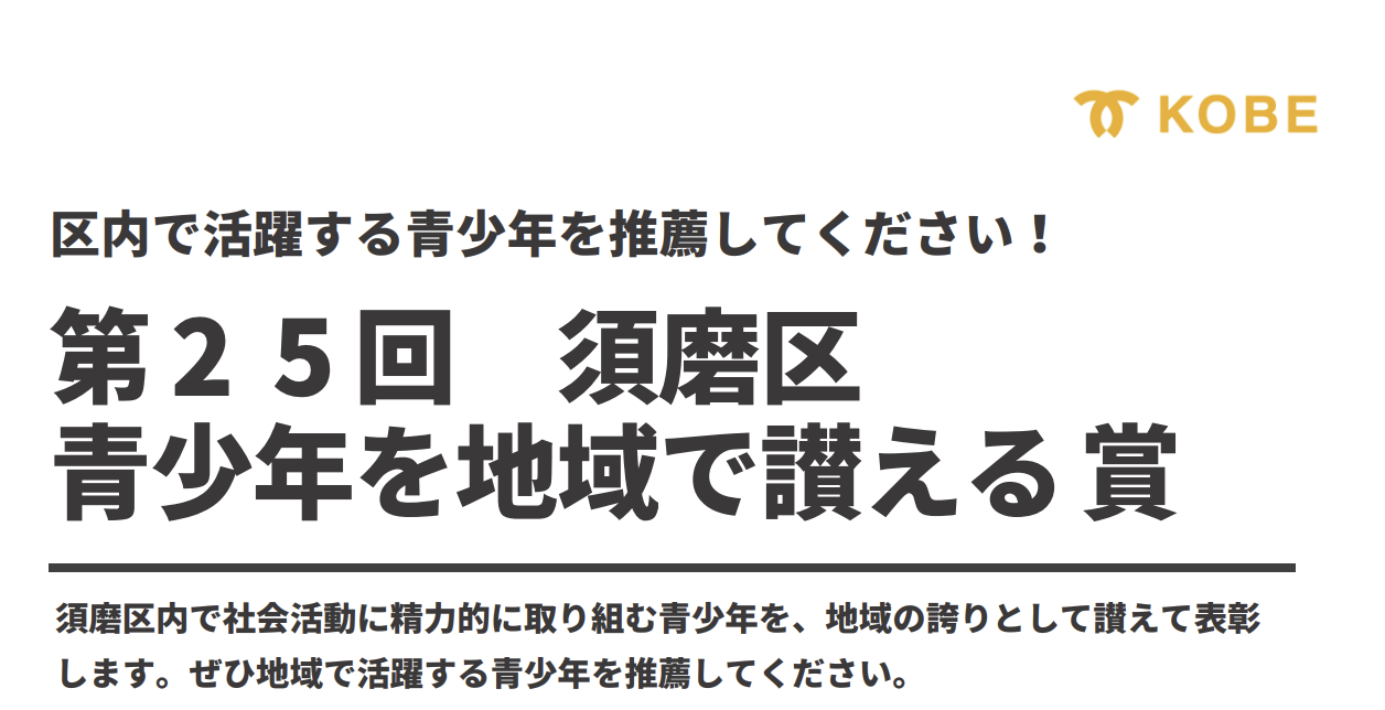 須磨区内で地域のために頑張る青少年を称えて、「第25回 須磨区青少年を地域で讃える賞」への推薦を募集しています。
