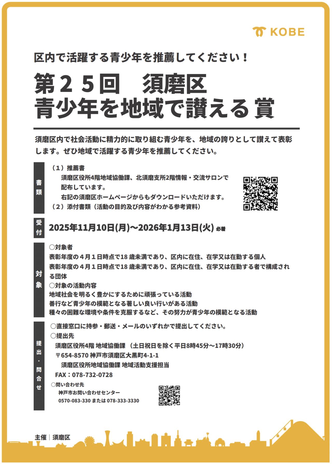地域社会に貢献する若者の活動を、地域みんなで応援する取り組みです。2025年度の表彰対象は、2025年4月1日時点で18歳未満の、須磨区内に在住・在学・在勤している個人、または同条件を満たす青少年で構成された団体です。