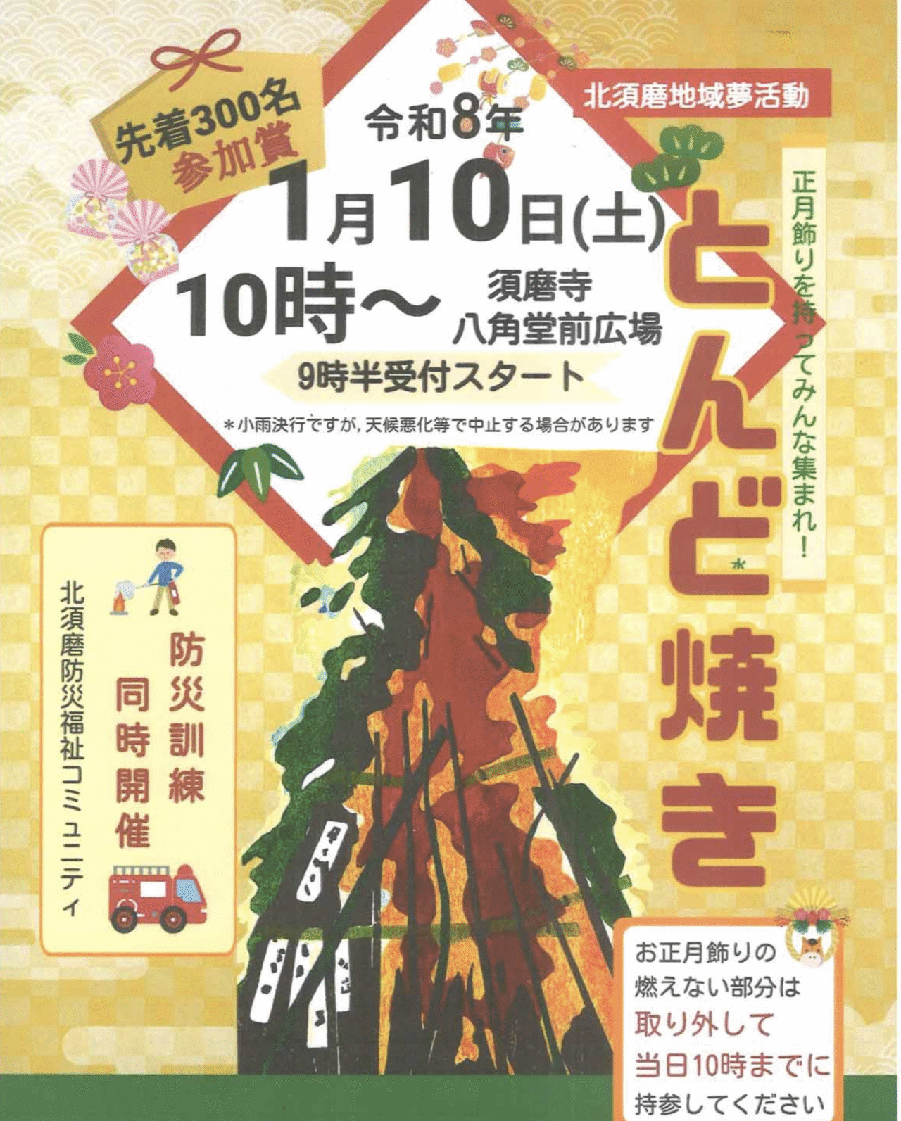 主催は北須磨地域夢活動実行委員会。地域の人たちが集い、正月飾りを焚き上げながら、一年の無病息災や家内安全を願う、地域に根付いた伝統行事です。防災訓練も同時開催され、地域防災への意識を高める機会にもなります。