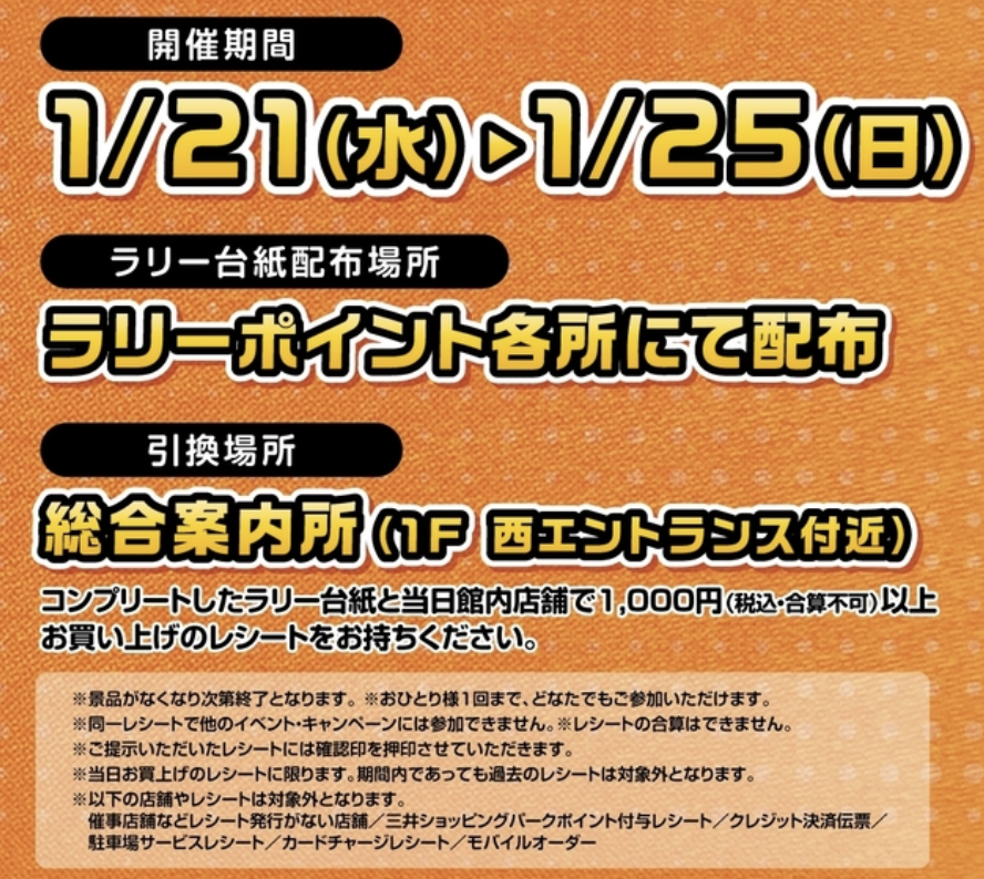 ・参加条件:スタンプ3個+当日1,000円(税込・合算不可)以上の買い物レシート(紙のみ)