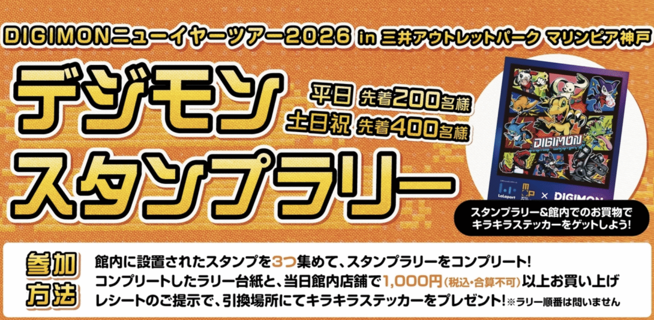 三井アウトレットパーク マリンピア神戸で、2026年1月21日から25日まで「DIGIMONニューイヤーツアー2026」が開催されます。