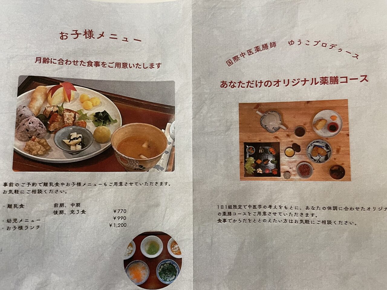 ランチは11:00〜12:50と13:00〜15:00の2部制。席数が限られるため予約がおすすめです。事前予約で離乳食やお子様メニューにも対応。お弁当や薬膳スパイスカレーのテイクアウト、日によっては夕方のお惣菜販売も行われています。