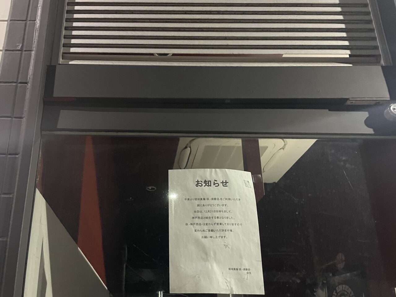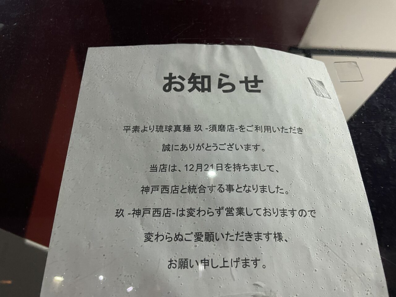 須磨駅近くにあった沖縄そば専門店「琉球真麺 玖-kyuh- 須磨店」の店頭にお知らせが掲示されていました。貼り紙によると、2025年12月21日をもって同店での営業を終了し、神戸市西区にある「神戸西店」と統合することになったそうです。