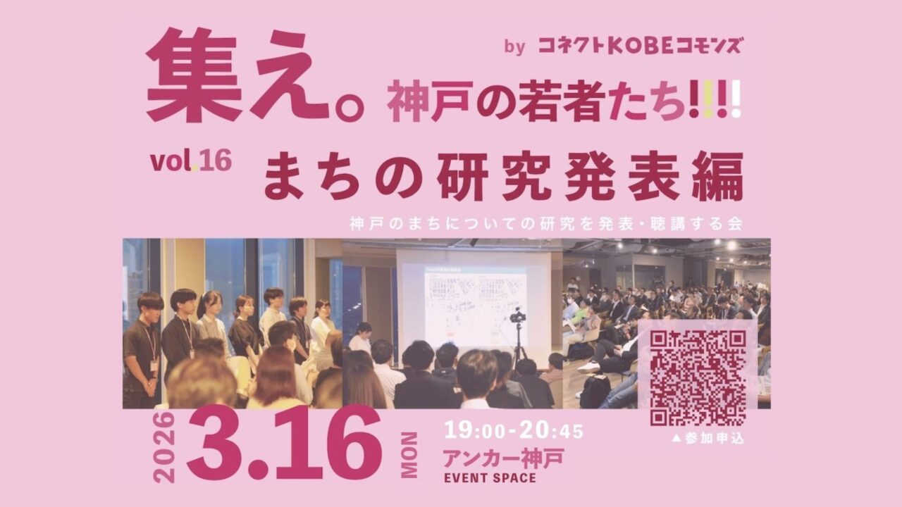 3月16日、学生たちが「神戸」をテーマにした研究成果を街の人へ披露する「コネクトKOBEコモンズ vol.16 -まちの研究発表編-」が開催されます。会場は神戸三宮阪急ビル15階にあるコワーキングスペース「アンカー神戸」。現在、自身の研究を“まちへのヒント”として発信してくれる学生発表者を募集しています。