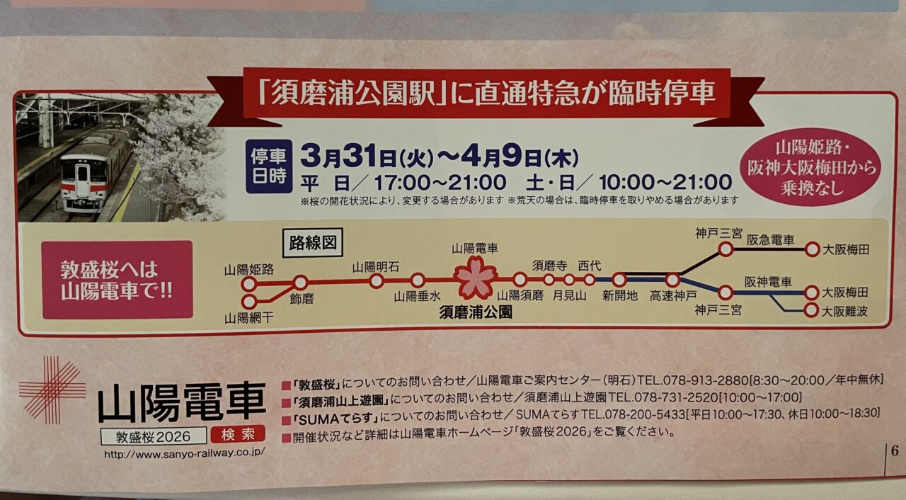 期間中は、山陽電気鉄道の直通特急が須磨浦公園駅に臨時停車。平日は17時以降、土日は10時以降から停車するため、アクセスも非常にスムーズです。なお、周辺道路や駐車場は大変混雑するため、公共交通機関の利用がおすすめです。
