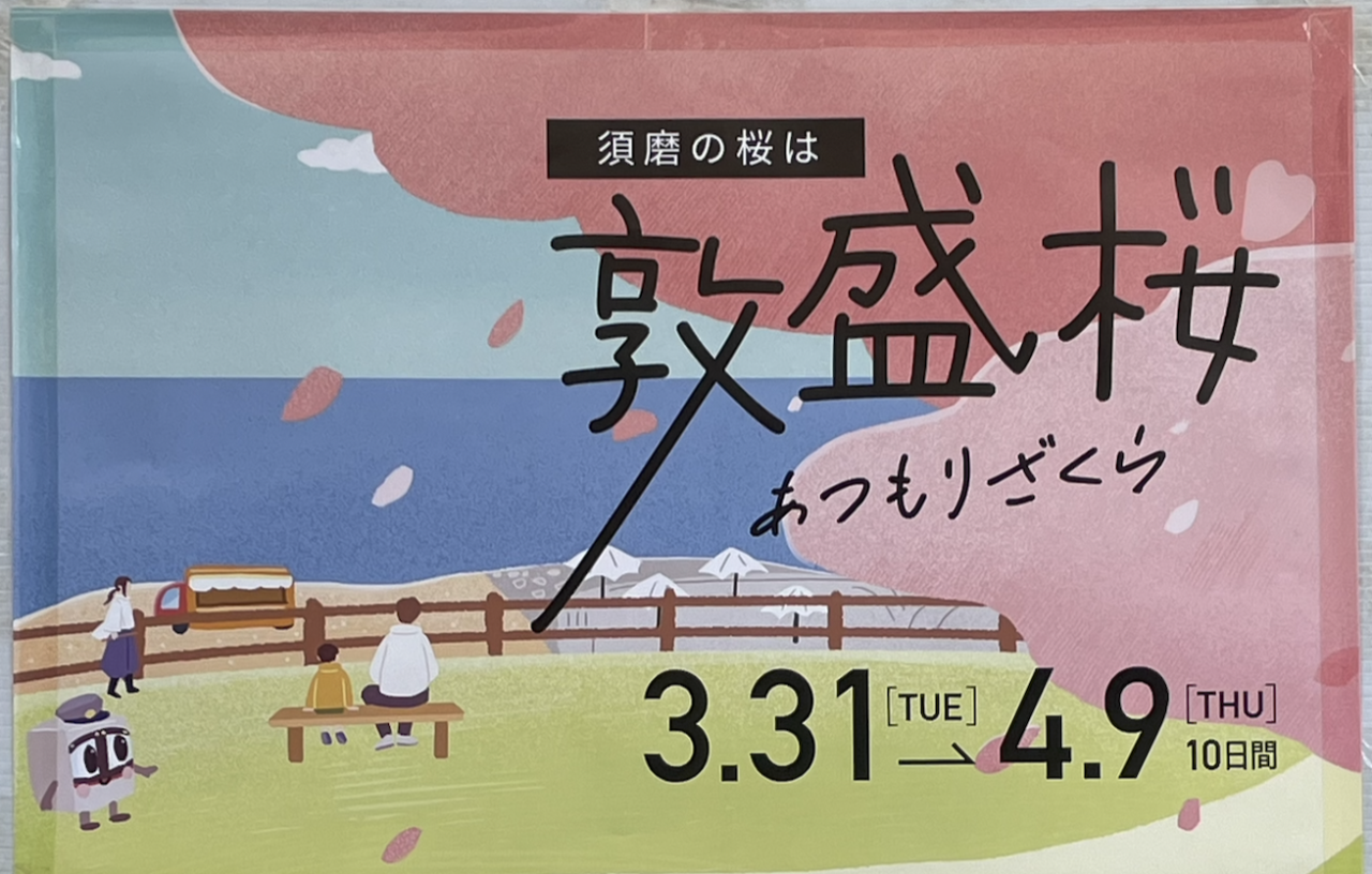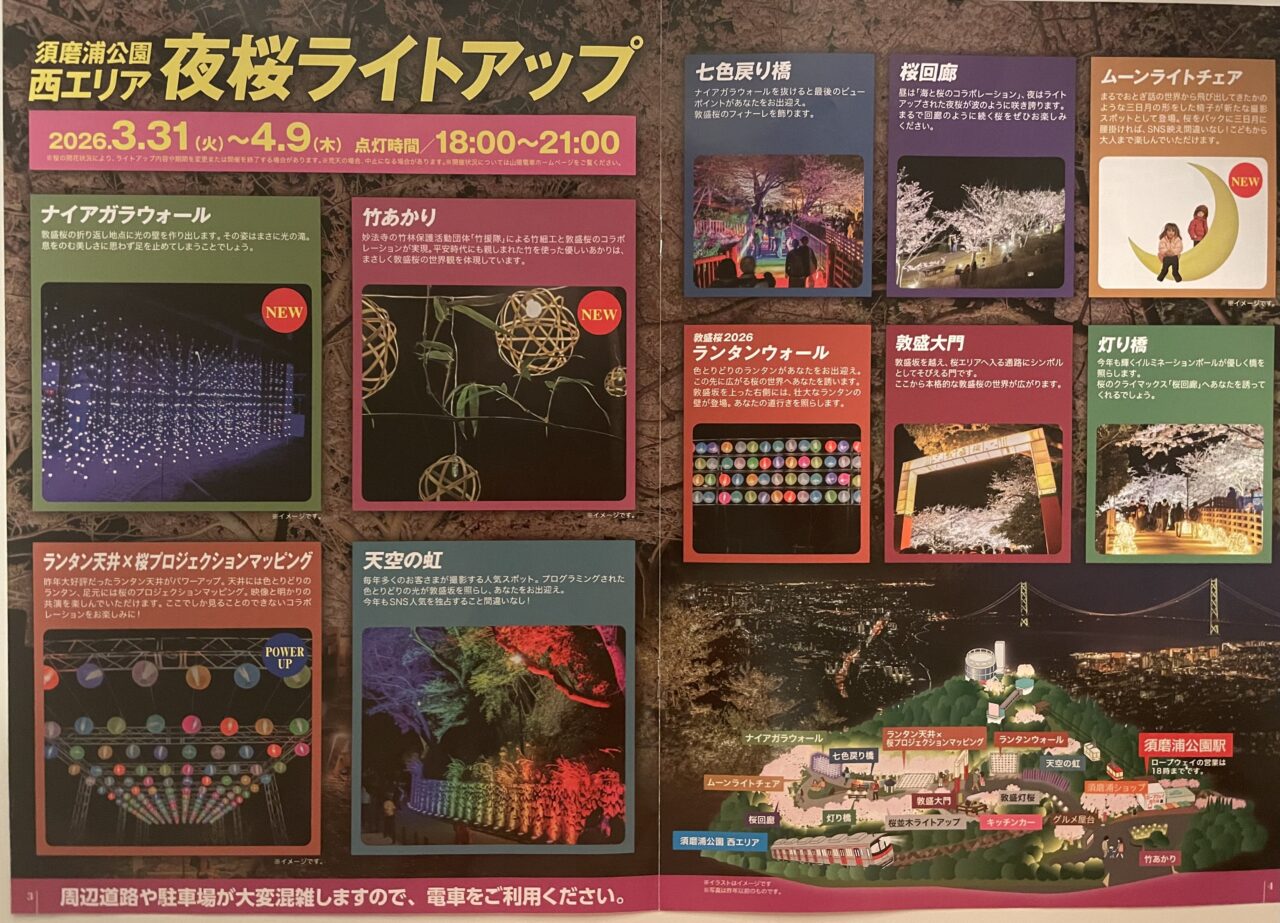 須磨浦公園にて、昼は海と桜のコントラスト、夜は幻想的なライトアップが楽しめる「敦盛桜 2026」が開催されています。