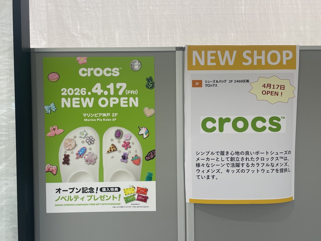 2026年4月17日(金)、三井アウトレットパーク マリンピア神戸の2階にフットウェアブランド「crocs(クロックス)」が新しくオープンします。