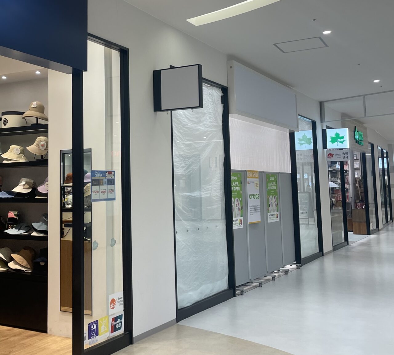 場所は2階、アウトドアショップのロゴスと帽子専門店の間に位置しています。