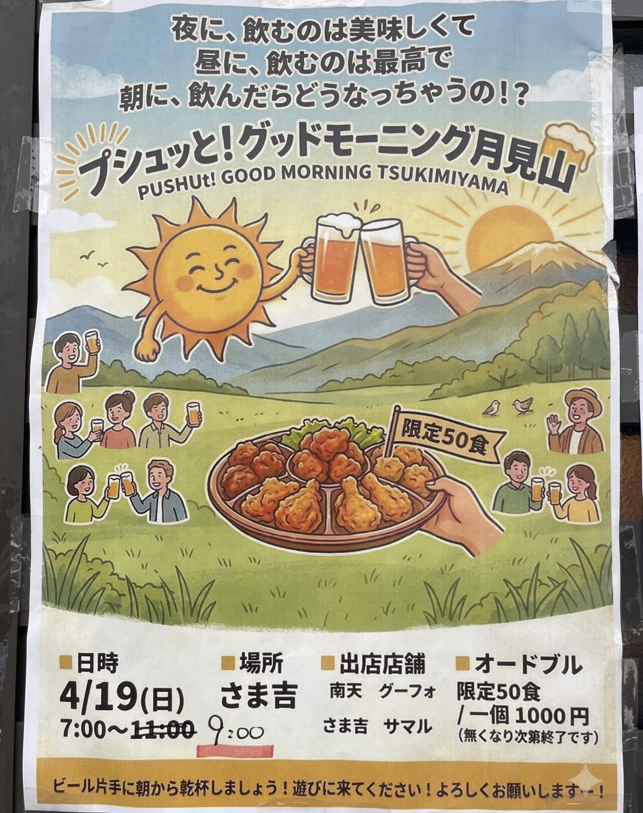 4月19日の朝、月見山の「つどい処 さま吉」前で乾杯を楽しむイベント「プシュッと!グッドモーニング月見山」が開催されます。