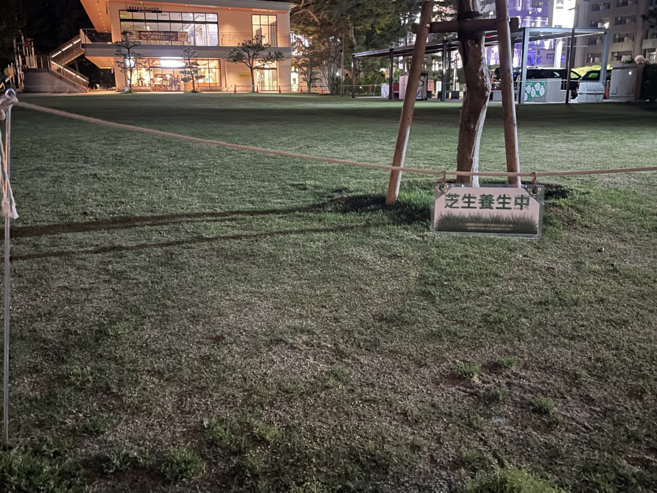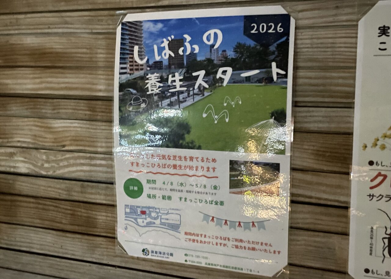 須磨海浜公園のメイン広場である「すまっこひろば」では、2026年4月8日(水)から5月8日(金)まで、元気な芝生を育てるための養生が行われています。周囲にはロープが張られ広場内への立ち入りができなくなっています。