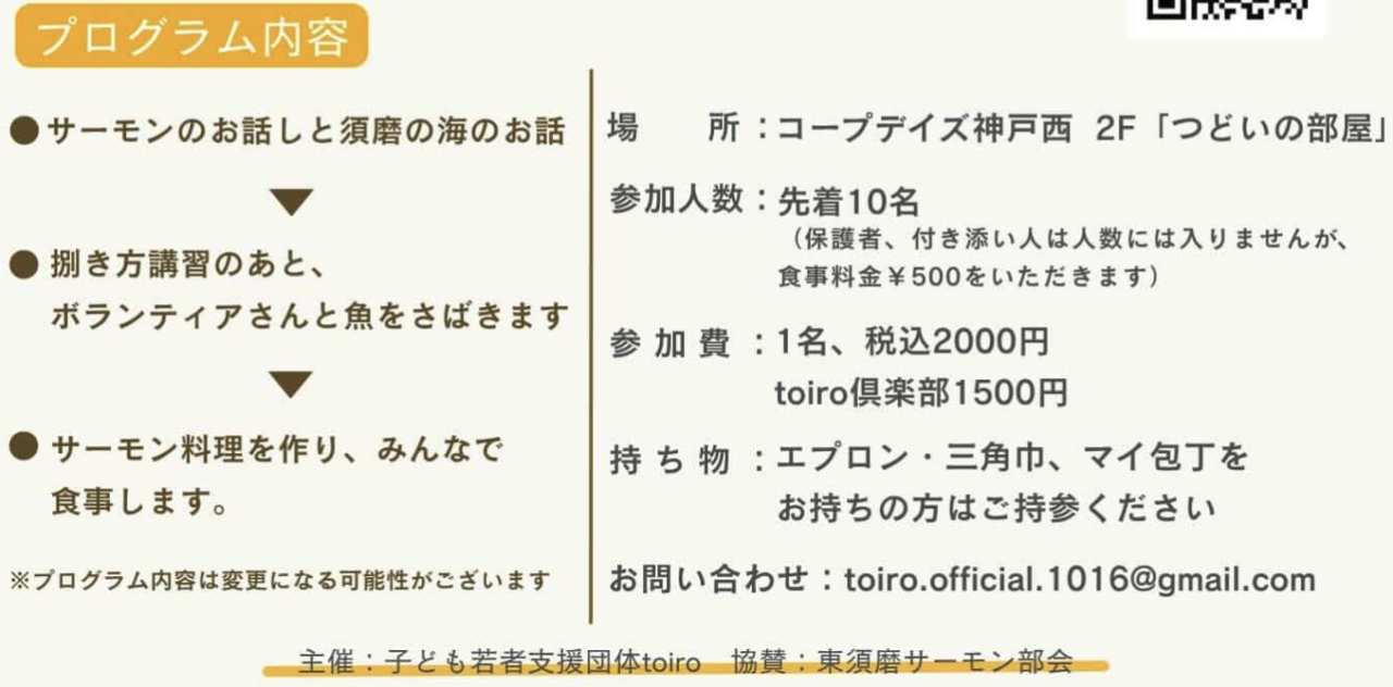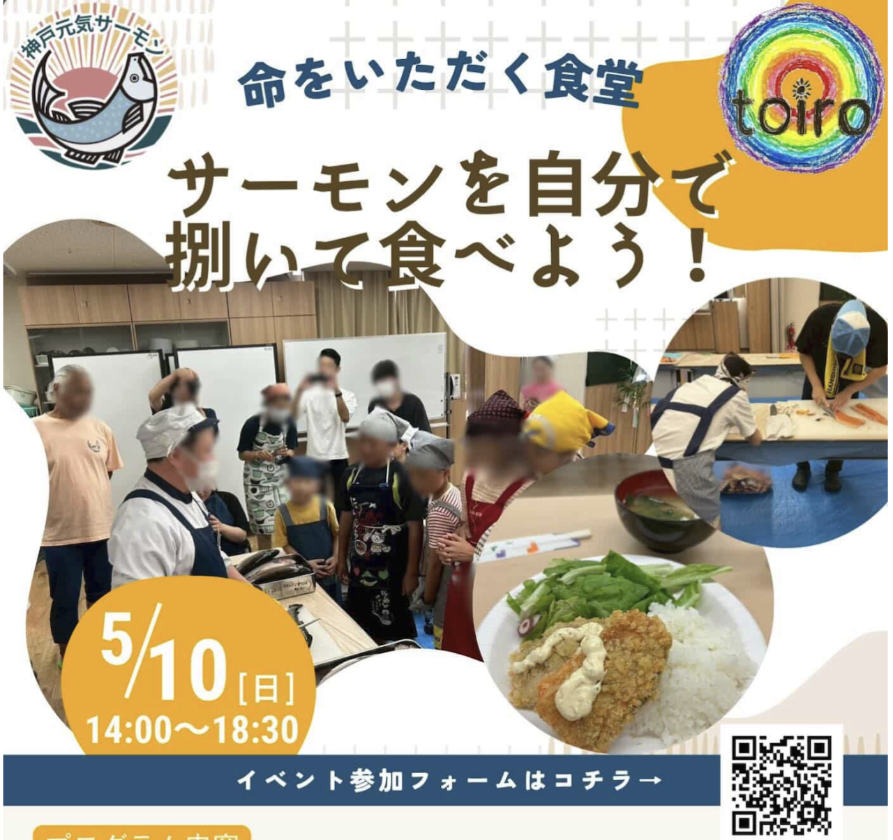 5月10日、須磨の海で育った「神戸元気サーモン」を捌いて味わう食育イベント「命をいただく食堂」がコープデイズ神戸西で開催されます。子ども・若者支援団体toiroが主催し、東須磨サーモン部会の協賛により実現した本企画は、毎年好評を集めている体験型イベント。魚を食べるだけでなく、食と向き合う時間を大切にする内容となっています。